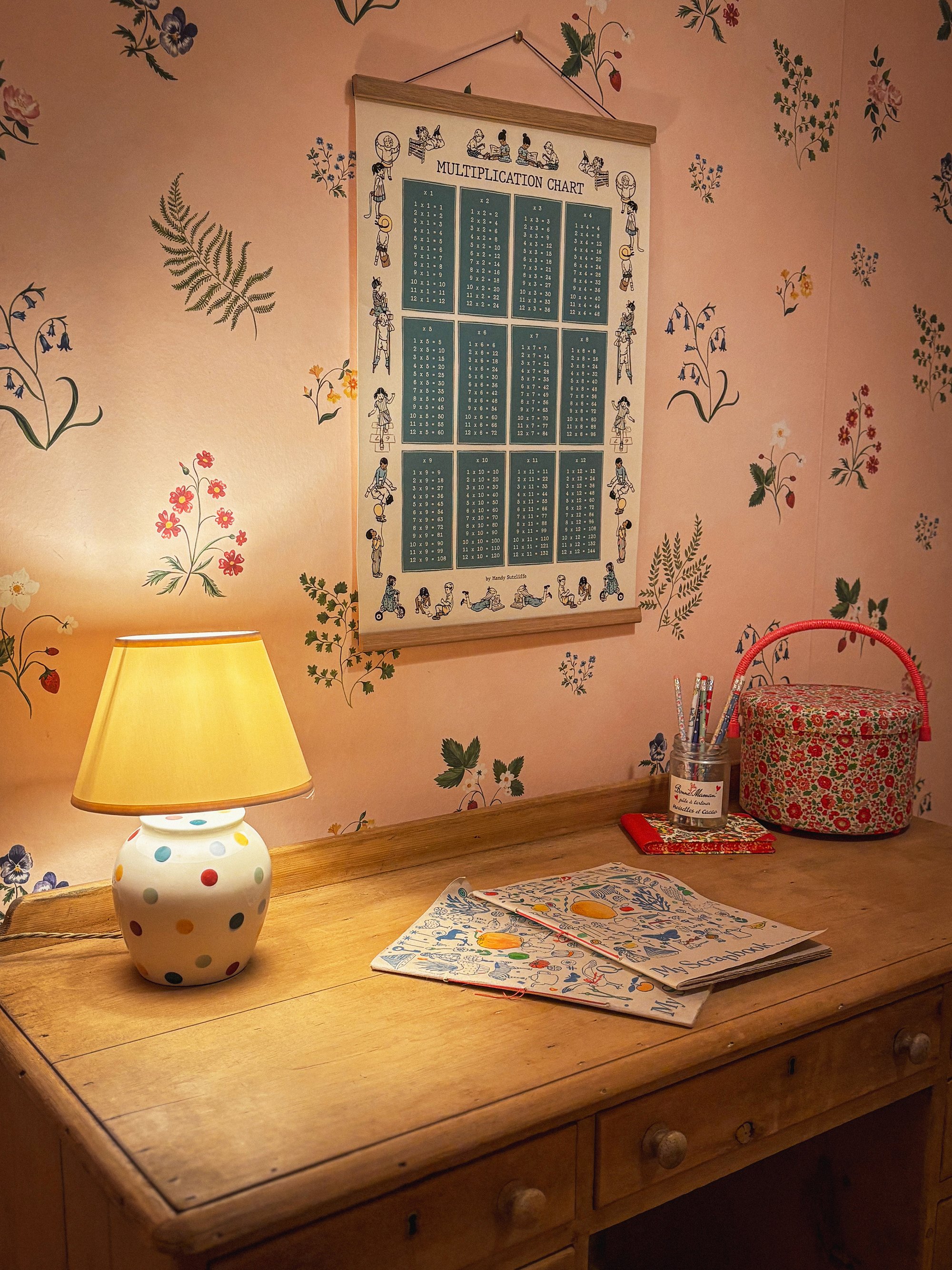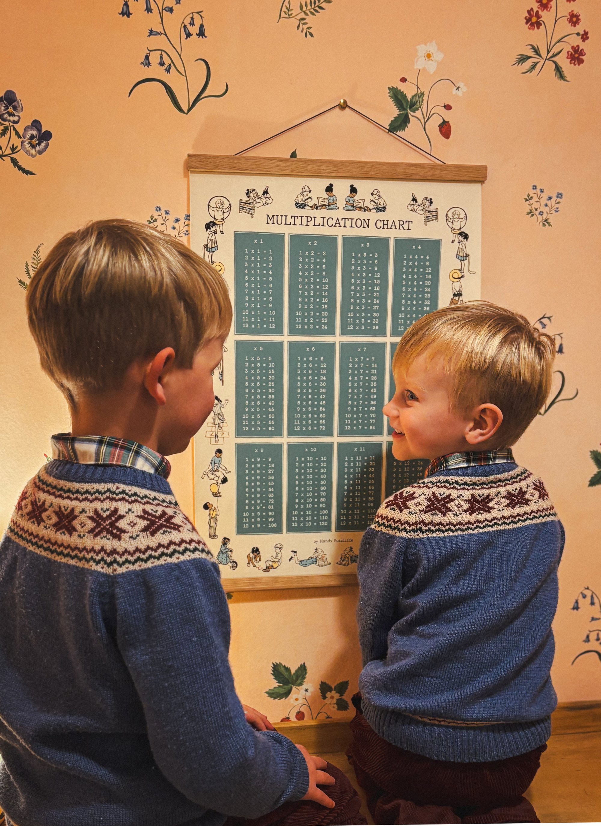 I illustrated this Times Tables Chart after searching high and low for a beautiful piece of educational art I could hang in my home, to help teach my children their times tables. Surrounding the columns of numbers 1-12 are my vintage story book style illustrations of sweet children playing, reading and counting. Available in 3 pretty colours, the perfect vintage style educational art work to adorn any playroom, bedroom or nursery (or if like me the down stairs loo!)